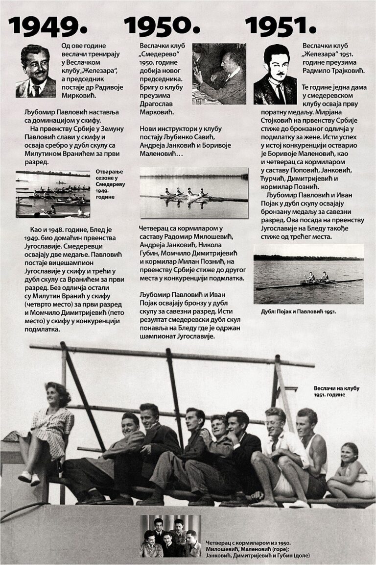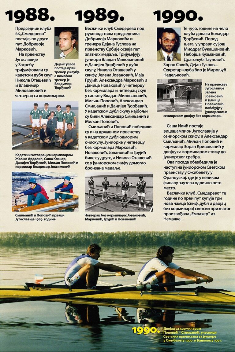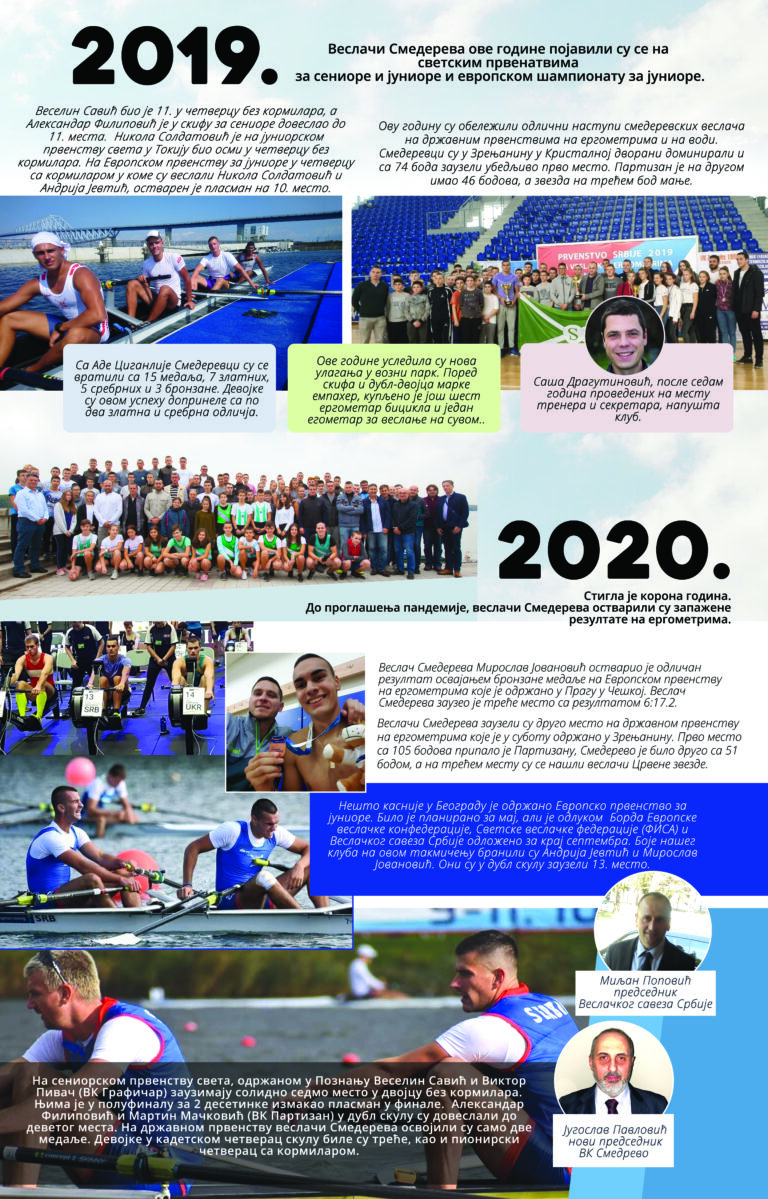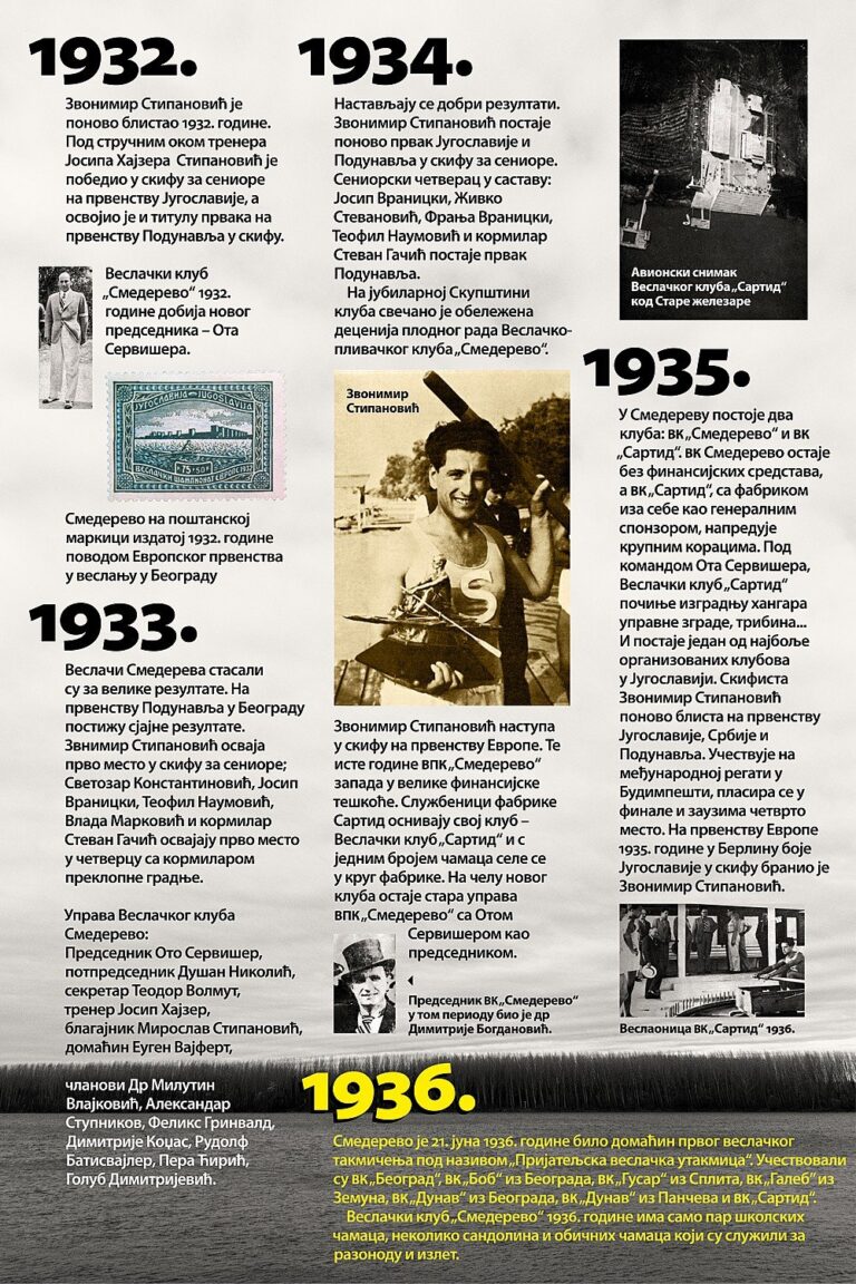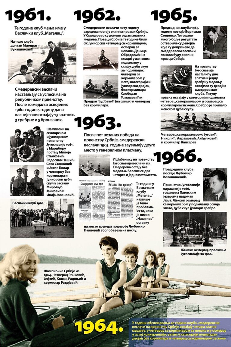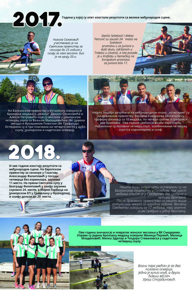 Čitav vek je iza nas. Za to vreme smo osvojilo nebrojeno medalja, pehara, ostvarili uspehe na domaćoj i inostranoj sceni, bili učesnici najbitnijih veslačkih dešavanja širom sveta i ostvarili nebrojeno mnogo prijateljstava. Priča o našem veslačkom klubu je priča od ljubavi, prijateljstvu i nereaskidivoj vezi Smedereva i Dunava!