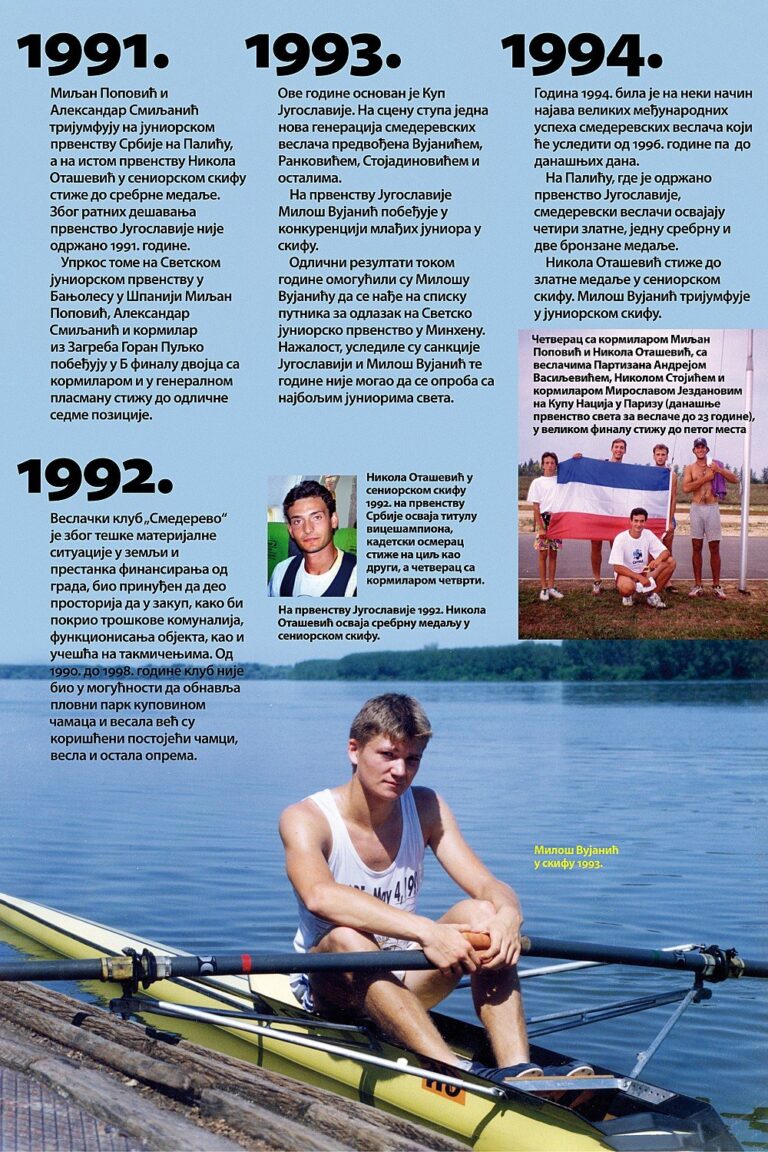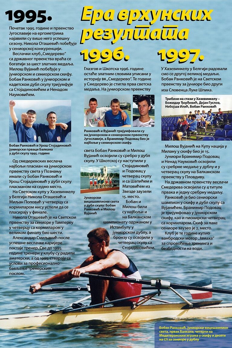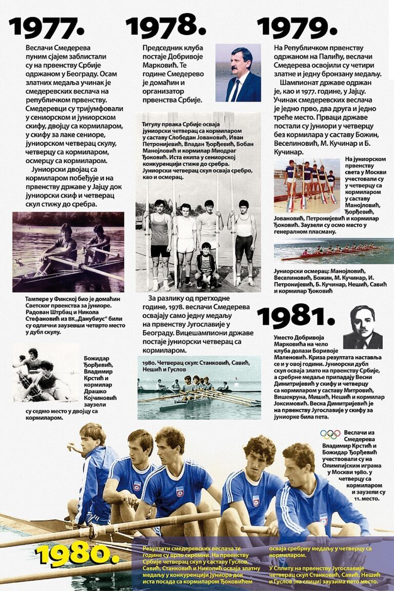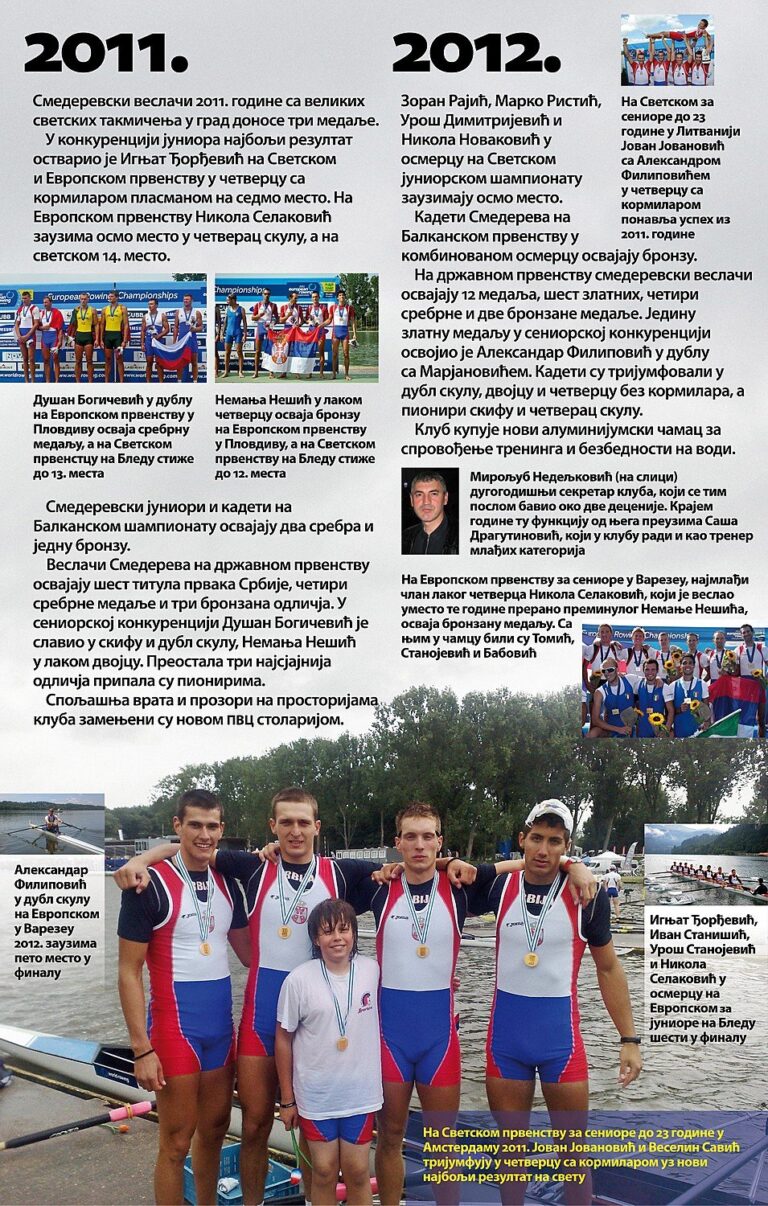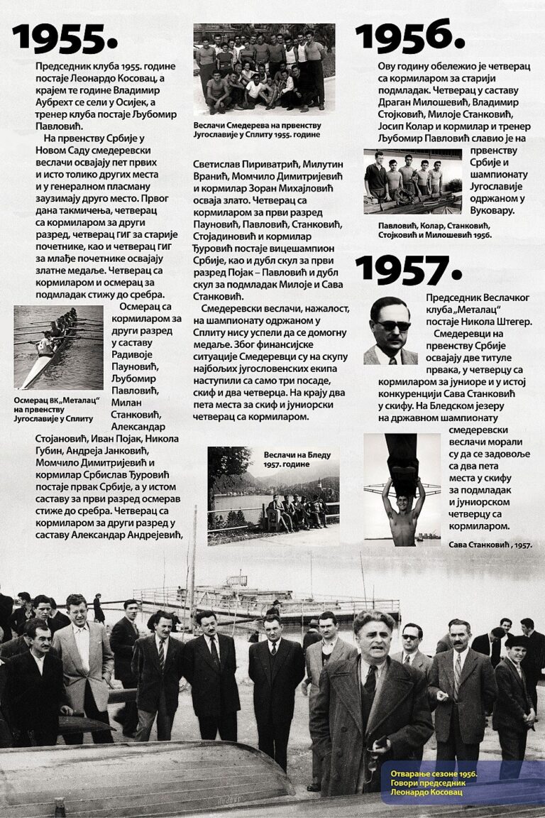 Čitav vek je iza nas. Za to vreme smo osvojilo nebrojeno medalja, pehara, ostvarili uspehe na domaćoj i inostranoj sceni, bili učesnici najbitnijih veslačkih dešavanja širom sveta i ostvarili nebrojeno mnogo prijateljstava. Priča o našem veslačkom klubu je priča od ljubavi, prijateljstvu i nereaskidivoj vezi Smedereva i Dunava!