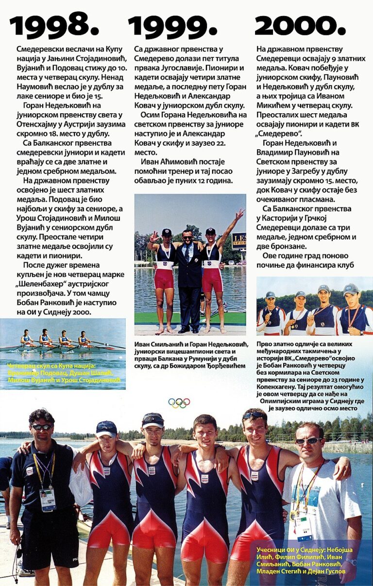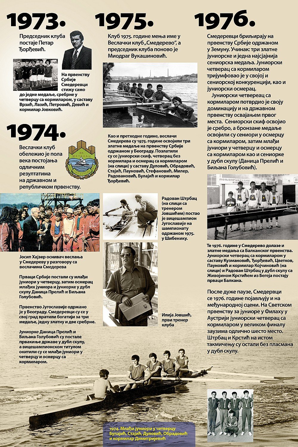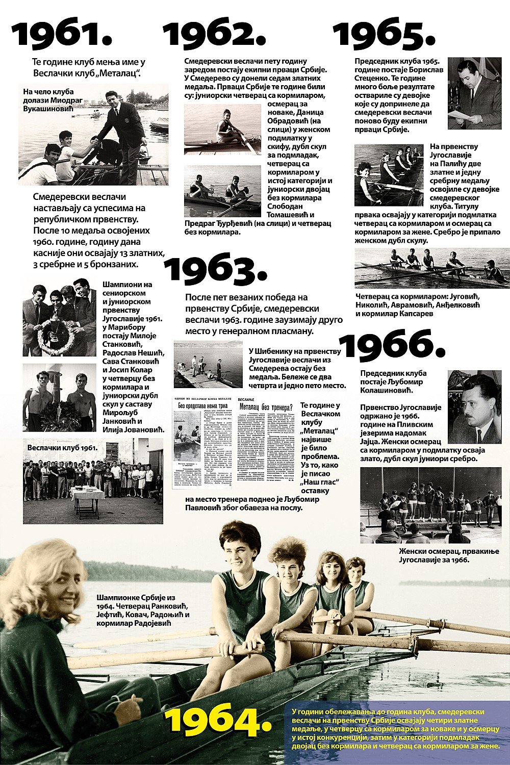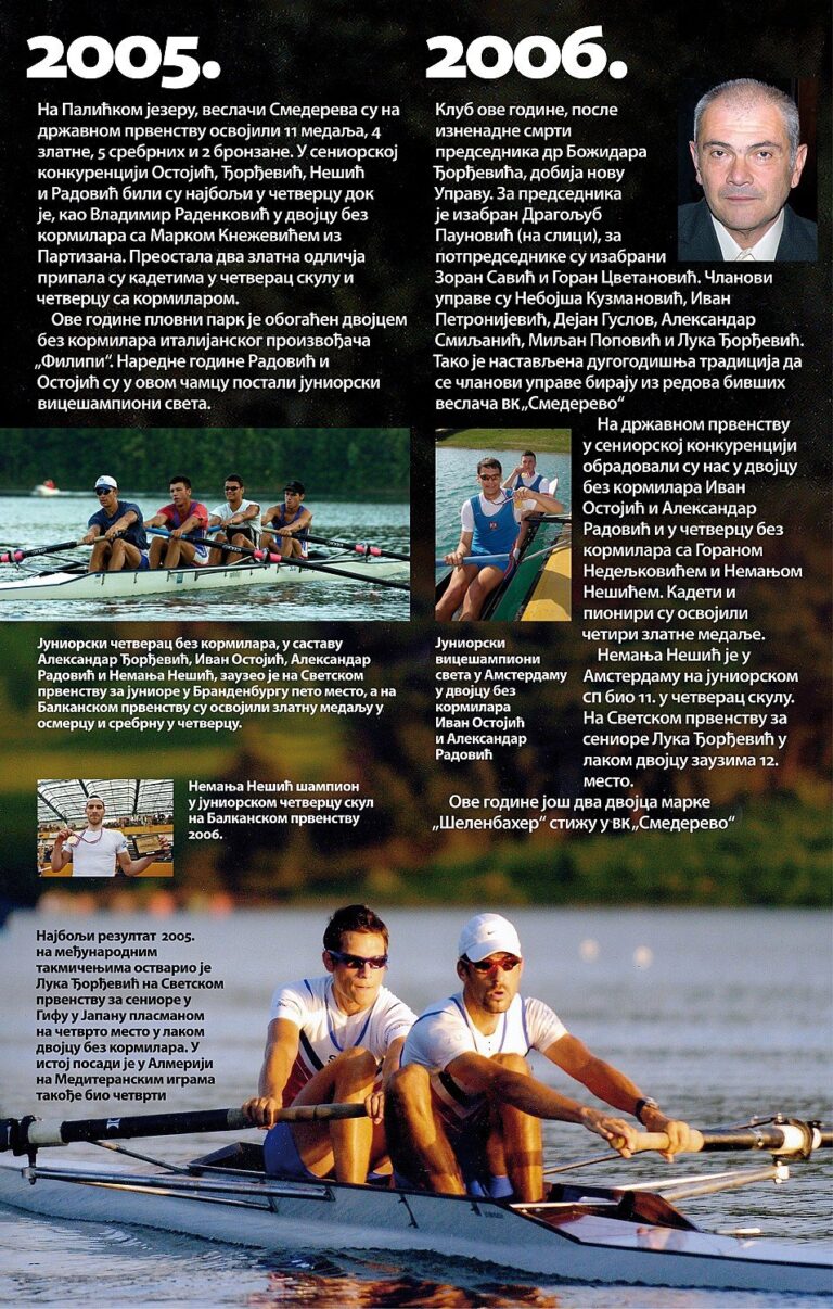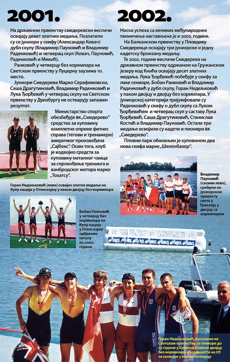 Čitav vek je iza nas. Za to vreme smo osvojilo nebrojeno medalja, pehara, ostvarili uspehe na domaćoj i inostranoj sceni, bili učesnici najbitnijih veslačkih dešavanja širom sveta i ostvarili nebrojeno mnogo prijateljstava. Priča o našem veslačkom klubu je priča od ljubavi, prijateljstvu i nereaskidivoj vezi Smedereva i Dunava!