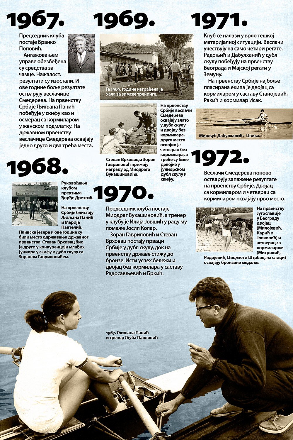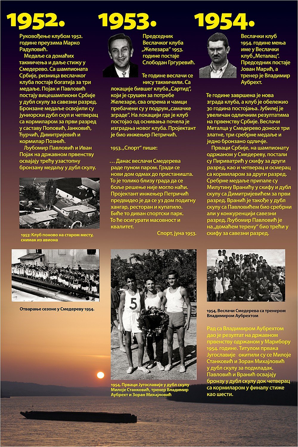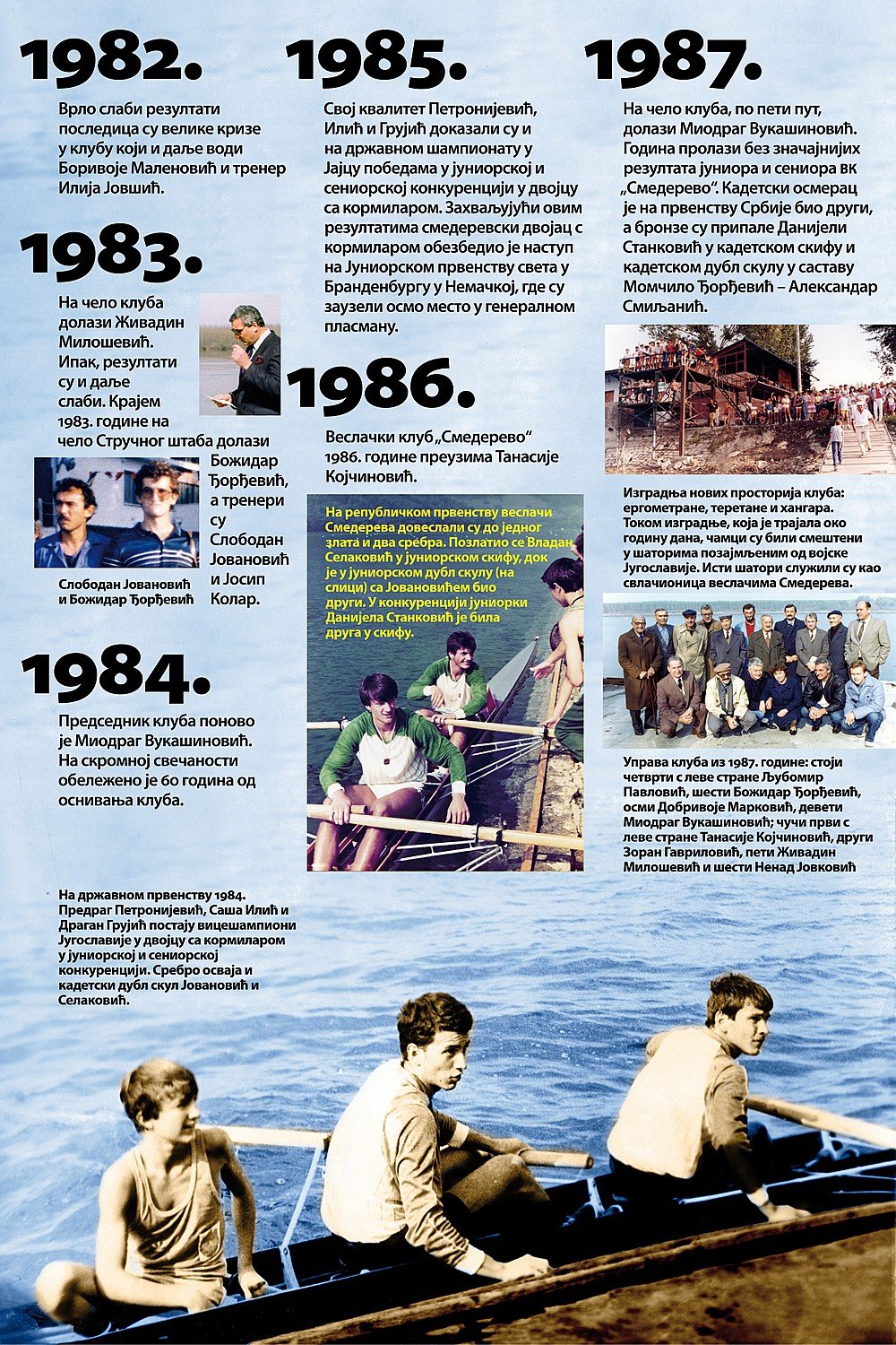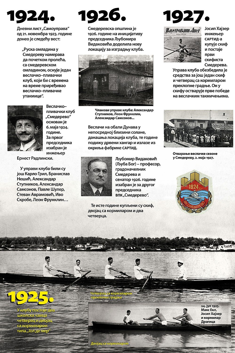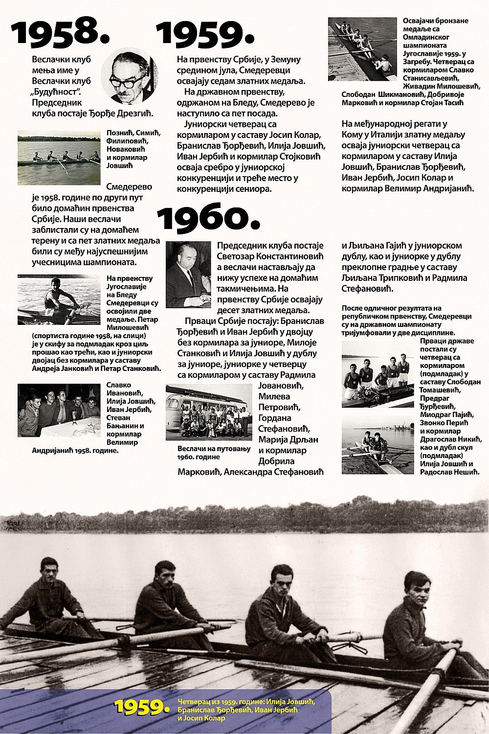 Čitav vek je iza nas. Za to vreme smo osvojilo nebrojeno medalja, pehara, ostvarili uspehe na domaćoj i inostranoj sceni, bili učesnici najbitnijih veslačkih dešavanja širom sveta i ostvarili nebrojeno mnogo prijateljstava. Priča o našem veslačkom klubu je priča od ljubavi, prijateljstvu i nereaskidivoj vezi Smedereva i Dunava!